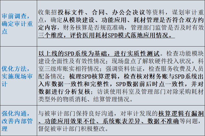 审计人员通过审查耗材采购招标程序、校对耗材验收入库票据和材料分配到科室清单等原始凭证,结合实地核查该药库耗材库,审查供应链流程是否合规、库存动态管理是否精准等方式,助力SPD耗材管理精细化。