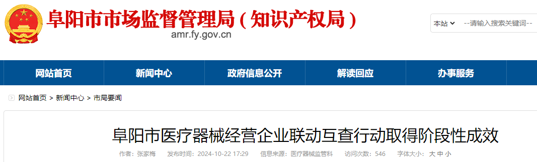 10月22日,阜阳市市场监管局发文,称日前全市医疗器械经营企业联动互查行动取得阶段性成效。