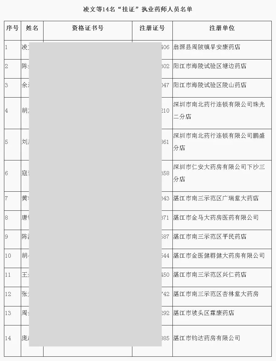 8月,广东省药品监督管理局发布通告,根据近期广东省各级药品监管部门对药品经营企业的监督检查结果,凌某等14名执业药师注册单位与实际工作单位不一致,存在“挂证”行为。