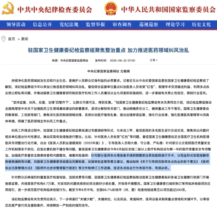 近日,据人民网报道,中央纪委国家监委驻国家卫生健康委纪检监察今年以来加力推进医药领域纠风治乱,督促综合监督单位重点纠治医务人员收受“红包”、假借学术交流输送利益、利用多点执业损公肥私等问题,并推动国家卫生健康委研究制定医疗机构工作人员廉洁从业九项准则实施细则,进一步落细有关禁止性规定,狠刹行业歪风。