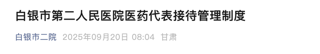 更早之前,甘肃白银市二院也发布公告,要求医药代表若需在院内开展产品学术推广等活动,需先向设备科、药剂科、招标采购办等职能部门登记建档,且相关资料需经院监会审核备查。