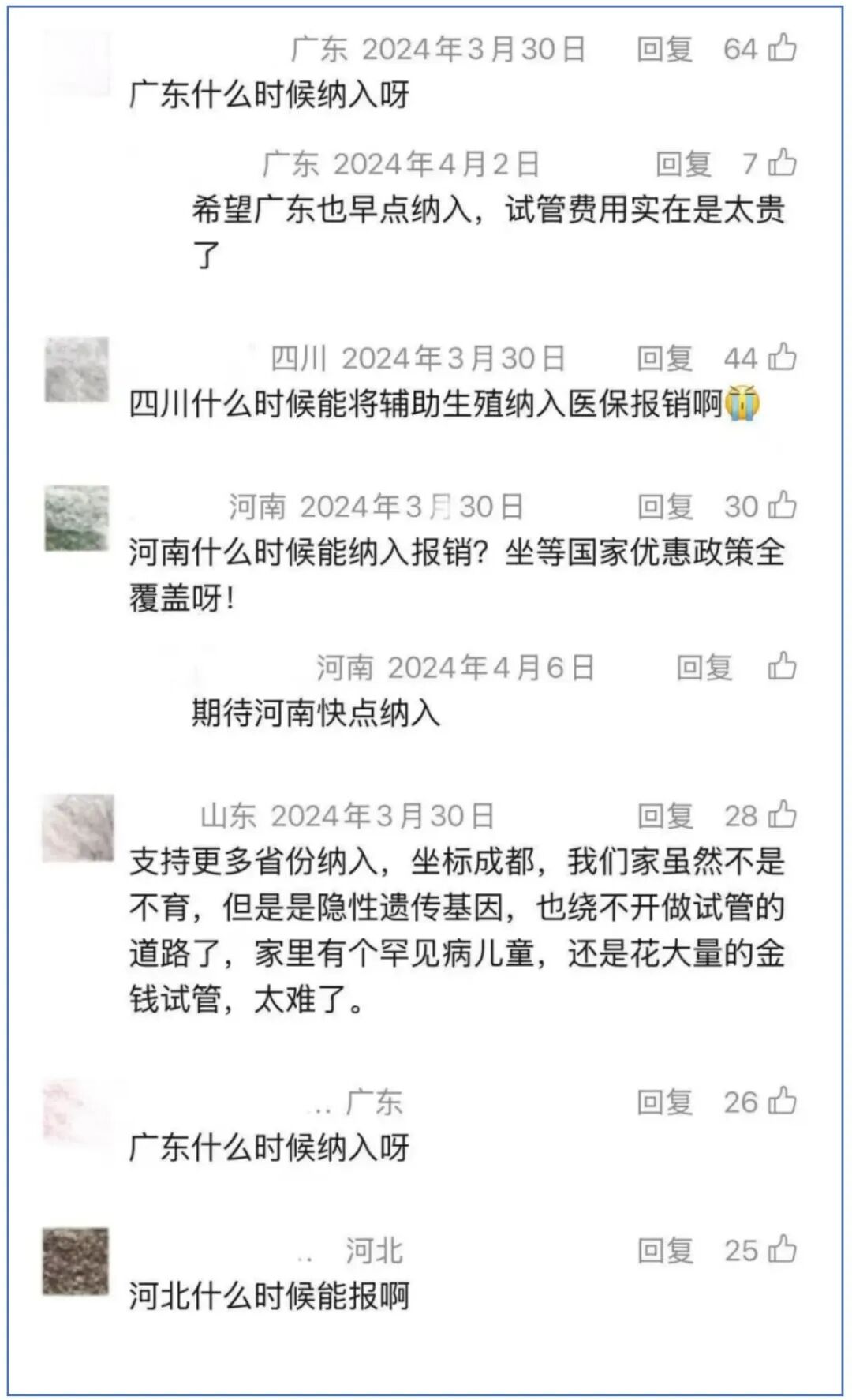 在国家医保微信公众号的评论区,许多网友写下朴素的心声:有人诉说多年求子的艰辛,也有人期待政策早日落到自己家乡。一条条留言背后,是一个个渴望完整家庭的普通人。