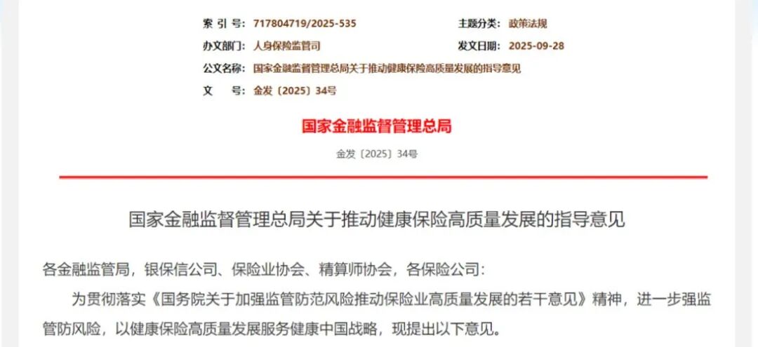 9月30日,金融监管总局发布《关于推动健康保险高质量发展的指导意见》,核心是构建全覆盖、多层次健康保险体系,形成事前预防、事中管理、事后赔付三位一体保障模式,到2030年建成满足全生命周期需求的健康保险市场格局。