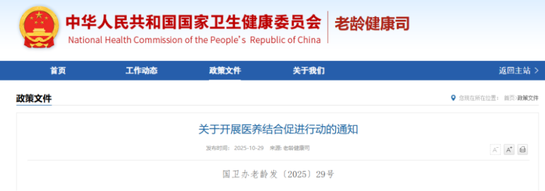 10月29日发布的《关于开展医养结合促进行动的通知》明确指出,“到2027年底,每个县(市、区、旗)至少1家医疗卫生机构或养老机构直接开展医养结合服务“,引导推动医疗资源较丰富地区的部分二级及以下医疗卫生机构转型为康复医院、护理院,为基层医疗机构转型医养结合、拓展综合服务明确方向。