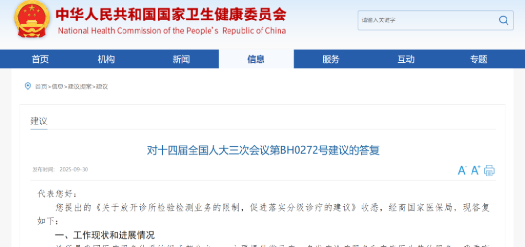 9月30日,国家卫健委针对 “放开诊所检验检测业务限制” 的人大代表建议正式作出答复。