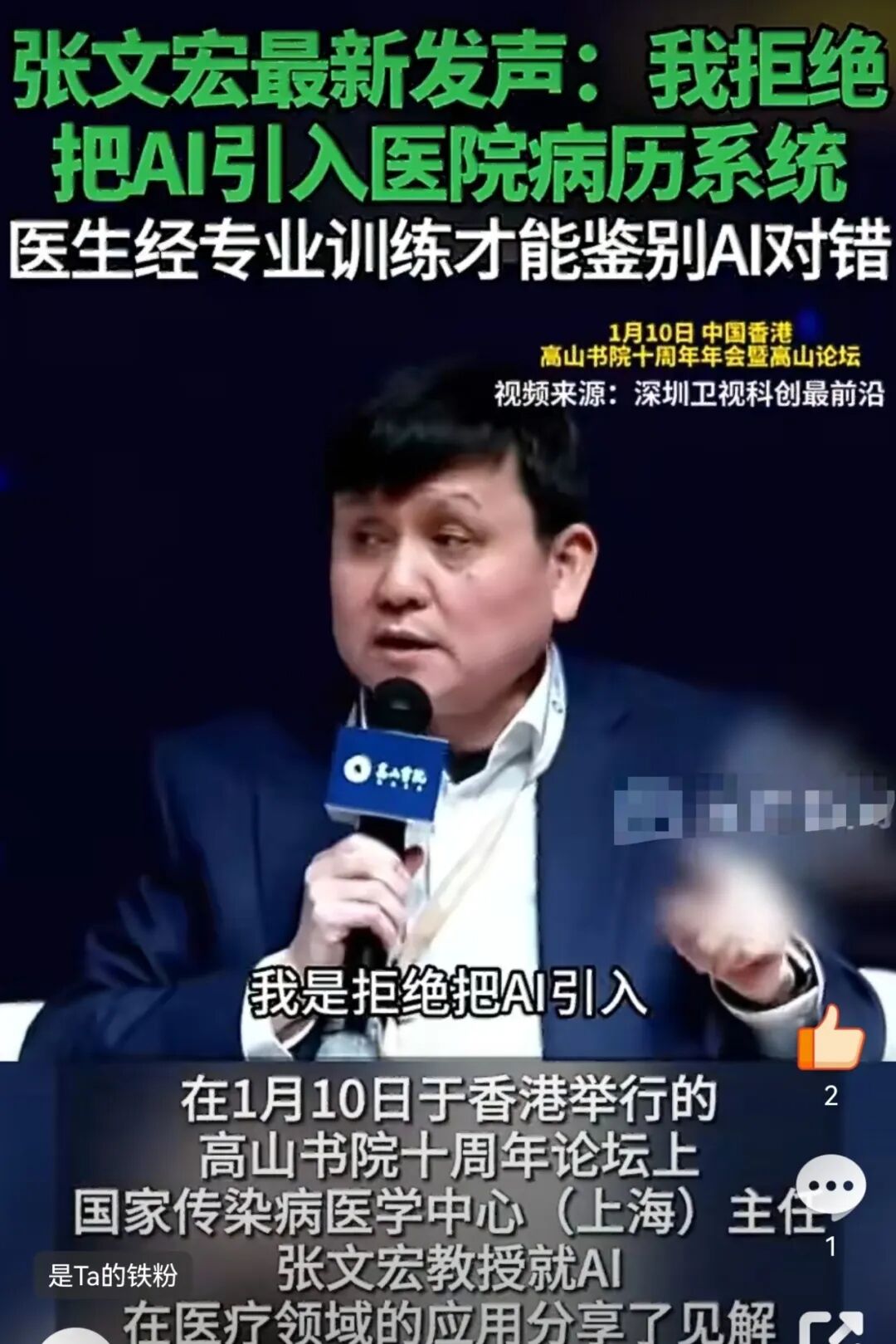 据视频内容显示,张文宏教授说:“我是拒绝把AI引入我们医生的日常生活的,你可以自己在那里用,但是不允许在我的病历系统里面用AI。”