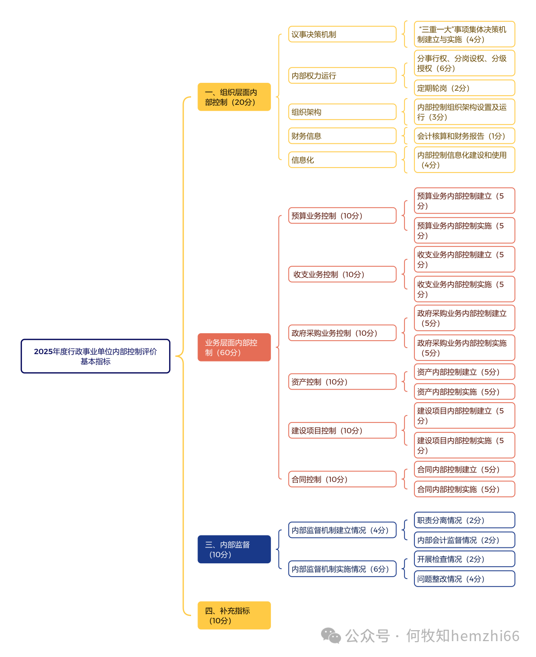 该评价基本指标总分共计100分,整体框架清晰、层级分明,分为四大类核心指标,各指标相互衔接、各有侧重,全面覆盖行政事业单位内部控制关键环节,具体构成如下: