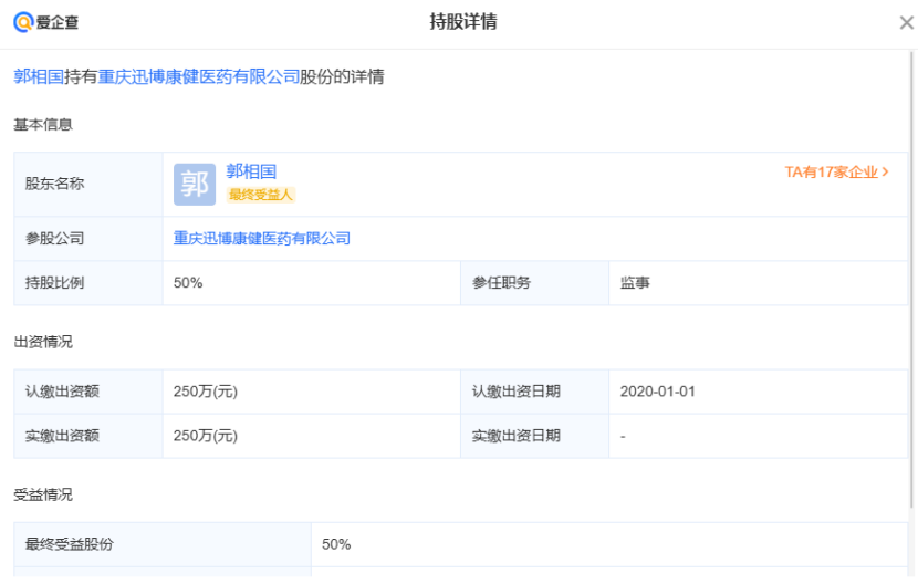 此次被国家市场监管总局点名的另一家企业重庆迅博康健医药有限公司,爱企查信息显示,其持股50%的大股东之一是郭相国。在2025年,同名人也曾经出现在反垄断案中,是被重点追责的自然人。