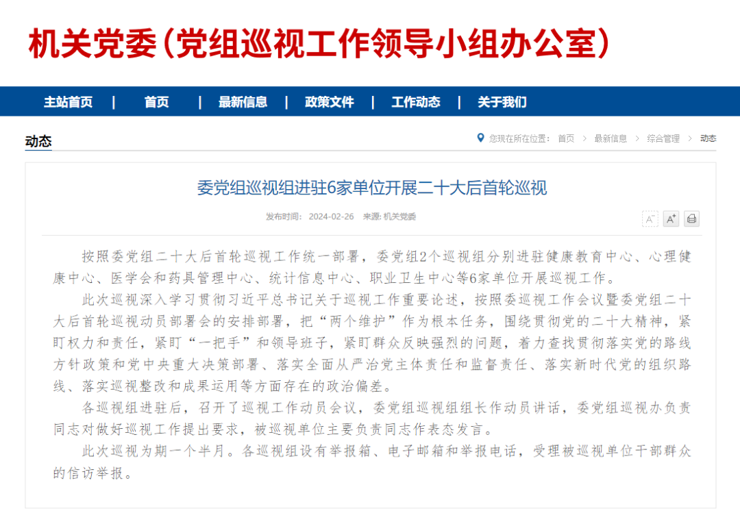 按照委党组二十大后首轮巡视工作统一部署,委党组2个巡视组分别进驻健康教育中心、心理健康中心、医学会和药具管理中心、统计信息中心、职业卫生中心等6家单位开展巡视工作。