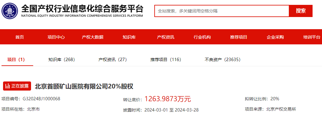 据全国产权行业信息化综合服务平台披露,近期,拥有国资背景的北京首颐矿山医院部分股权将被挂牌转让,拟转让比例为20%,转让底价约1263.99万元,转让方为首钢集团有限公司。