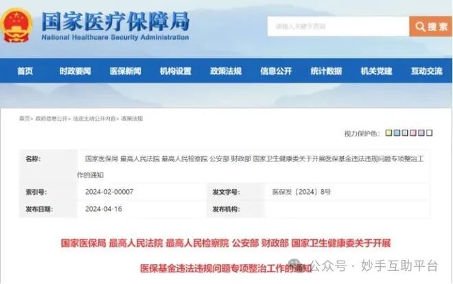 4月16日,国家医保局等五部门联合印发了《2024年医保基金违法违规问题专项整治工作方案》,在全国范围开展医保基金违法违规问题专项整治工作。