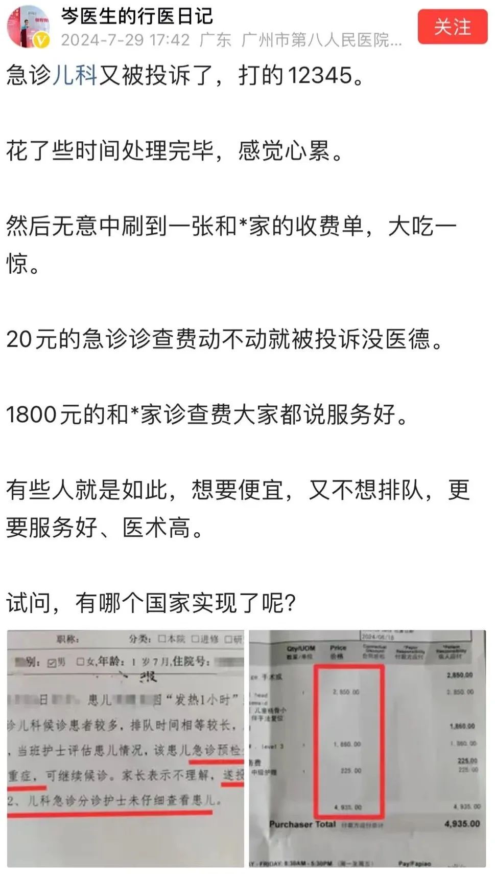 患者投诉后,该院儿科副主任医师岑医生第一时间表达了自己的心情,他无奈气馁地说道:“我们花了些时间处理这起投诉,已经完毕,感觉很心累。20元的急诊诊查费,动不动就被投诉没医德,有些人就是如此,想要便宜,又不想排队,更要求服务好、医术高,怎么去满足?试问,有哪个国家实现了呢?当医生为什么那么难?”