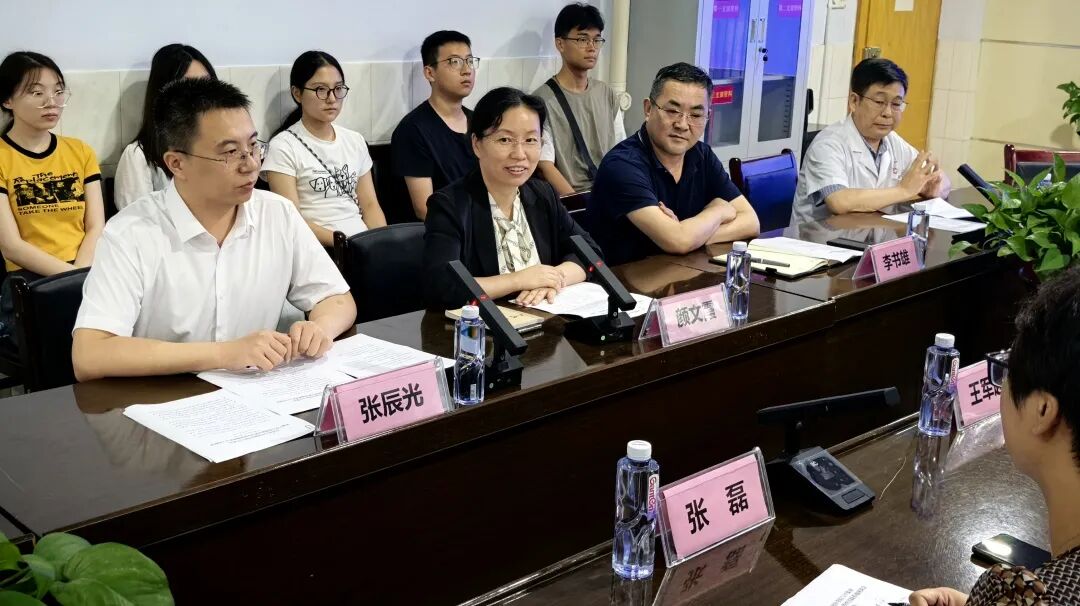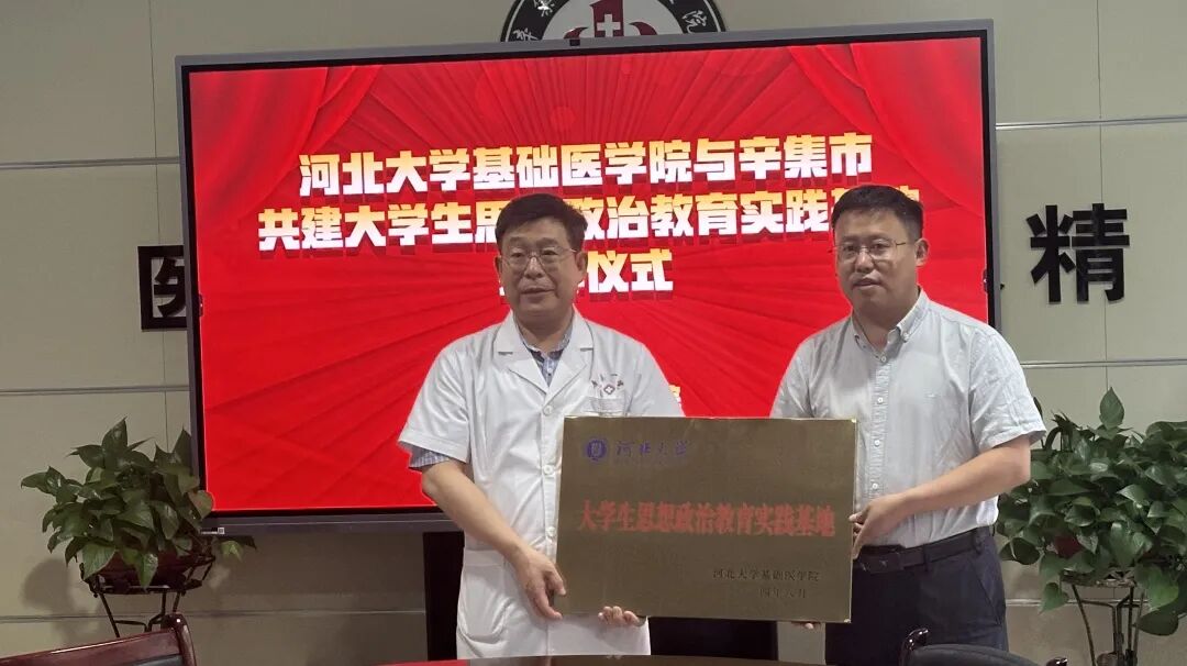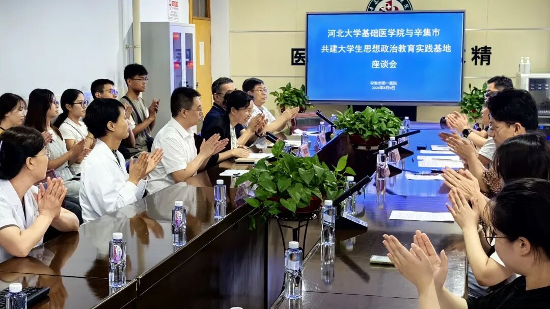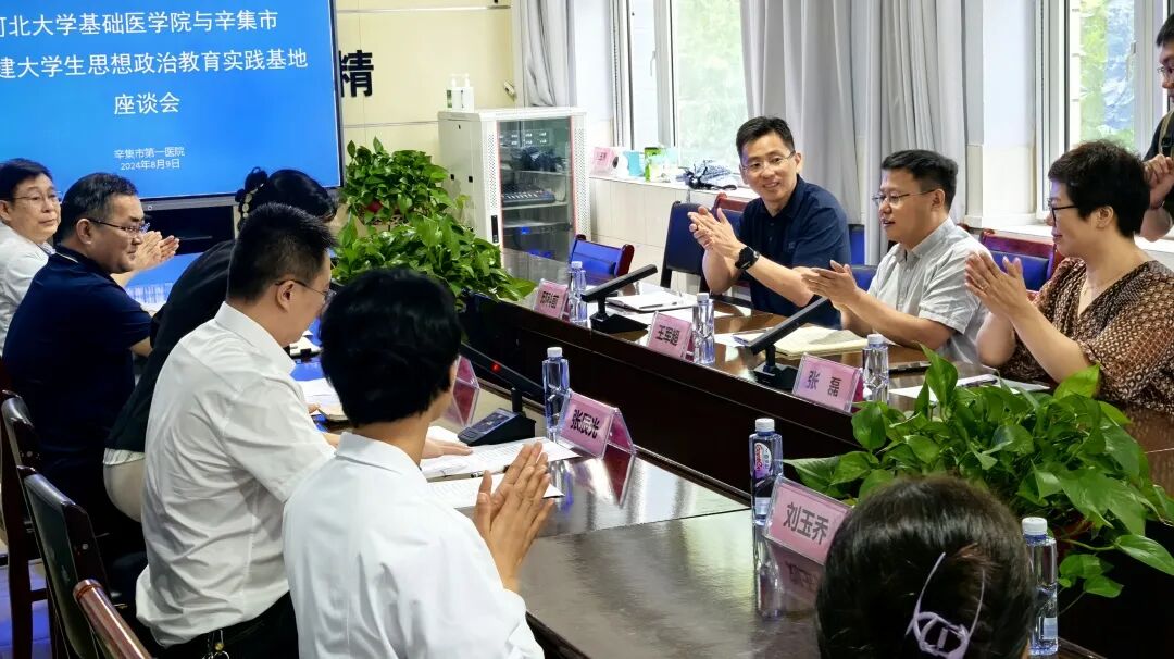 2024 年 8 月 9 日,河北大学基础医学院与辛集市共建大学生思想政治教育实践基地座谈会在辛集市第一医院召开。座谈会由辛集市团委书记张辰光主持,辛集市人民政府副市长颜文霞、辛集市卫健局局长李书雄、河北大学基础医学院党委副书记王军超、河北大学基础医学院团委书记张磊、河北大学基础医学院理化党支部书记邸科前、辛集市第一医院党总支书记尹亚鹏等领导参加座谈会。与8名参加社会实践活动的学生,共同探讨思想政治教育实践的重要意义和未来发展方向。 颜文霞副市长首先对河北大学基础医学院同学的到来表示热烈欢迎,并表示辛集市文化底蕴深厚,红色文化源远流长,是大学生思政社会实践基地的首选之地。同时医学实践是医学生成长为优秀医疗人才的必经之路,通过实践,不仅能够巩固专业知识,更能培养出医者的仁爱之心和责任感。 随后河北大学基础医学院领导向辛集市第一医院颁授“大学生思想政治教育实践基地”牌匾。 学生代表表示在今后的学习过程中要理论联系实际,共同探讨如何把理论知识知识更好的应用于实际医疗情境中去,提高自身的综合素质和职业素养,为未来的医学事业打下坚实的基础。 辛集市第一医院党总支书记尹亚鹏代表辛集市第一医院对远道而来的河北大学各位领导、老师及同学们表示欢迎,表示医学教育不仅仅是专业技能的培养,更是医德医风、人文关怀等综合素质的塑造。我们非常高兴与河北大学基础医学院共建大学生思想政治教育实践基地,医院不仅获得了很多宝贵的经验,而且架起了医院与学生们沟通的一座桥梁,同时也促进医院提升医疗服务水平与质量。 河北大学基础医学院党委副书记王军超从历史演变、文化、红色教育以及目前学校的专业、特长等方面等全方位的介绍河北大学,同时为医学生们分析了当前医疗领域的机遇与挑战。他指出,随着科技的飞速发展和社会需求的不断变化,同学们要紧跟时代步伐,不断学习新知识、新技术,以适应未来医疗工作的多样化需求。