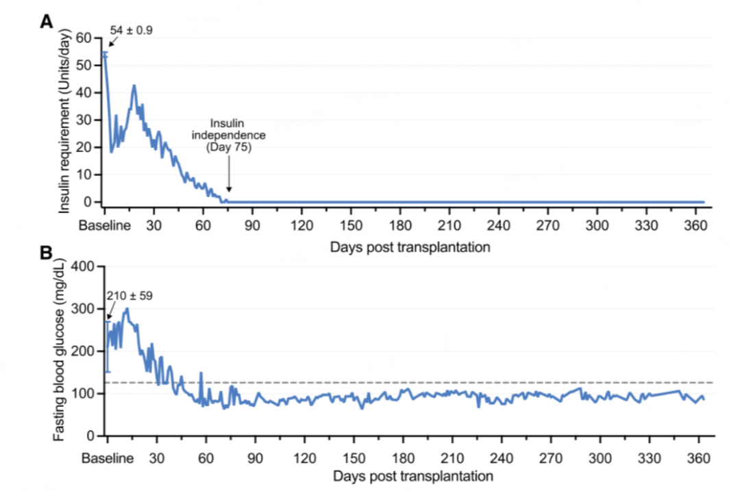 在完成移植后的两周内,患者每日需要注射的胰岛素用量开始下降。术后第18天起,下降趋势逐渐趋于稳定,直到第75天时,患者彻底摆脱了胰岛素,疗效已稳定1年以上。与此同时,她的空腹血糖也在持续降低,长期维持在正常值。