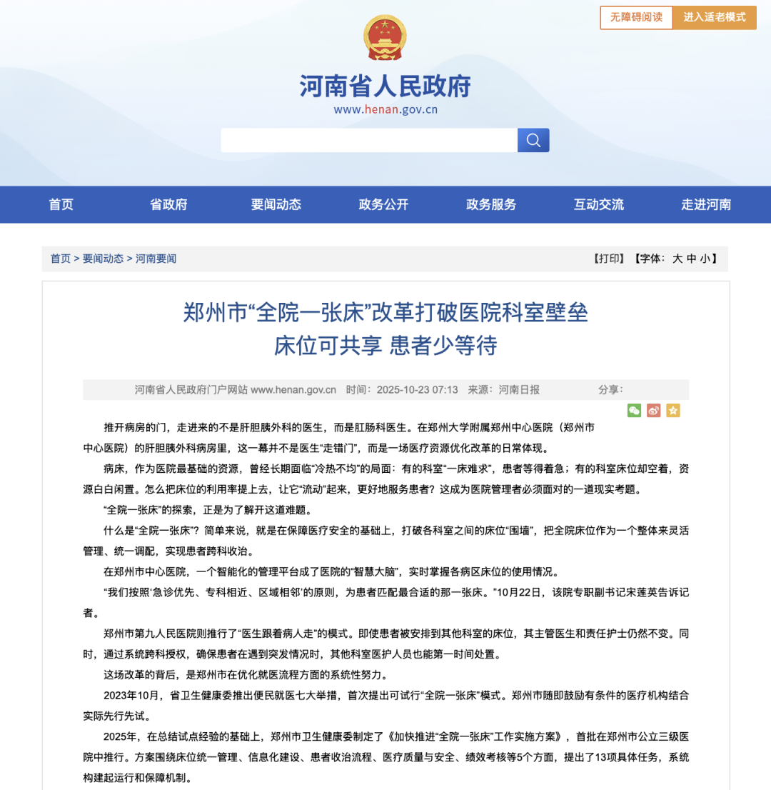 前言 昨日,河南省政府发布郑州市于2025年全市三级医院推行“全院一张床”,并于2026年全市所有二级以上医疗机构推进. 本期我们从医院运营视角探讨“全院一张床”下的管理细节,如何处理各科室的支出数据. 2024年,北京市发布改善医疗服务工作方案,鼓励医疗机构试点“全院一张床”.目前,22家市属医院已全部落实“全院一张床”管理,有效缩短患者住院等待时间. 2025年,郑州市首批在公立三级医院推行,到2026年年底,全市所有二级及以上医疗机构全面实行 优质的医疗资源稀缺的,一些头部医院某些科室出现了“一床难求”的现象. 而且、不同科室因专业特点、季节因素、手术排期等影响,床位使用率波动较大.高峰期部分科室“一床难求”的情况更加严重、对患者而言.往往因等待目标科率的床位而延误治控时机、或被迫辗转其他医院、增加患者身心负担和经济成本,等待过程中的焦虑和不满意度显著升高. 为了让大家少排队、早住院、缩短等待住院床位时间,提高患者的满意度,让床位流动起来,让患者早日得到治疗. ①病情就轻:轻症患者优先跨区,重症患者留在原病区. ②楼层就近:尽量安排同层或上下层,减少电梯往返, ③学科相近:相近病种放在同一病区,护理流程同质化. ④病区设施同质化:急救车、监护仪、康复器材等每个病区统一标准配备. ⑤护理服务同质化.开发跨学科护理操作SOP手册+专科护士结对指导机制. ①构建信息系统,建立床位系统平台,实现全院床位统一管理的模式. ②制定跨区收治规则,对符合条件的医保患者采用预住院模式. ③优化和制定24h内完成整个诊疗流程的医疗服务,推进日间医疗促进病区运营效率. ④预出院标准化管理.通过多部门联合,对预出院流程进行再造,提供出院带药送病区、床旁结算、出院病历邮寄到家等多项改造. ⑤分层收治急诊患者.设置急诊患者绿色通道,优先收治急危重症. △广州爱尔眼科 “全院一张床”模式把医护的主从关系变为密切合作关系,护理价值独立体现. 护理不再是依附于医疗,而是变为主动竞争的新形势.将护理病区作为最终的成本中心. 一方面是因为“全院一张床”下,医生跟着患者走,全院以患者为中心,而患者主要在护理病区管理,因此消耗的主要资源在护理病区. 另一方面是考虑成本归集的便捷性,医院固定资产(房屋、病房设施、治疗设备等)的成本核算主要依附于护理病区,日常的取药、领取耗材也是由护士完成,医院日常的运行费用通常直接归集于患者所在的场所(病区),如水费、电费、取暖费、保洁费、洗涤费等. 通过对比以护理病区为成本中心、以医生组为成本中心和以患者为成本中心三种方法的优缺点(见表1),最终选择以护理病区为成本中心建立“全院一张床”下科室成本核算模型. “全院一张床”模式下成本核算单元在原来四类科室(行政后勤科室、医疗辅助科室、医疗技术科室、临床科室)基础上,将临床科室的住院病区分为护理病区和医生组. 需要对HIS系统进行及时更新改造,方便收入支出数据对接入对应的绩效分配单元. △泰康同济医院 医生组成本主要是医生产生的直接成本和分摊的间接成本,如医生人员费用、差旅费、培训费、医生办公室的折旧费、手术中的材料费等,以及摊入的其他三类科室成本. 护理病区成本包括护士人员费用、药品费、日常卫生材料费、固定资产折旧费、无形资产摊销费,以及根据患者收入提取的医疗风险基金、其他商品服务费用和摊入的间接费用. (1)以患者为中心,将经过三级分摊的住院医生组人员费用采用诊疗时间为参数,在医生组间进行分摊,以调整患者的会诊成本和MDT成本. 某专科医生组成本=直接成本+间接成本=医生组的人力成本①+医生差旅费+医生培训费+医生办公室资产折旧费、维修费+患者术中材料费+分摊管理成本+分摊医辅成本+分摊医技成本 ①某专科医生组的人力成本=该医生组人员费用-摊出的人员费用②+摊入的人员费用③ ②摊出的人员费用=该医生组单位时间人员费用×外出会诊时间 ③摊入的人员费用=∑其他医生组单位时间人员费用×本组患者接受其他医生组会诊时间 (2)按照一个护理病区对应多个医生组的关系,将专科医生组成本采用患者的医疗服务收入占比为参数,在护理病区间进行分摊,按照成本分类逐一结转,最终形成以护理病区为维度的科室成本. 科室成本=护理病区三级分摊之后的成本+医生组摊入成本④ ④医生组摊入成本=∑患者医疗服务收入占比⑤×患者对应专科医生组成本 ⑤患者医疗服务收入占比=该患者医疗服务收入÷对应医生组归集的患者总医疗服务收入 最终形成“科室”成本核算结果,既能满足法定成本报表上报需要,也为后续的医疗服务项目成本和DRG/DIP成本核算做好铺垫.