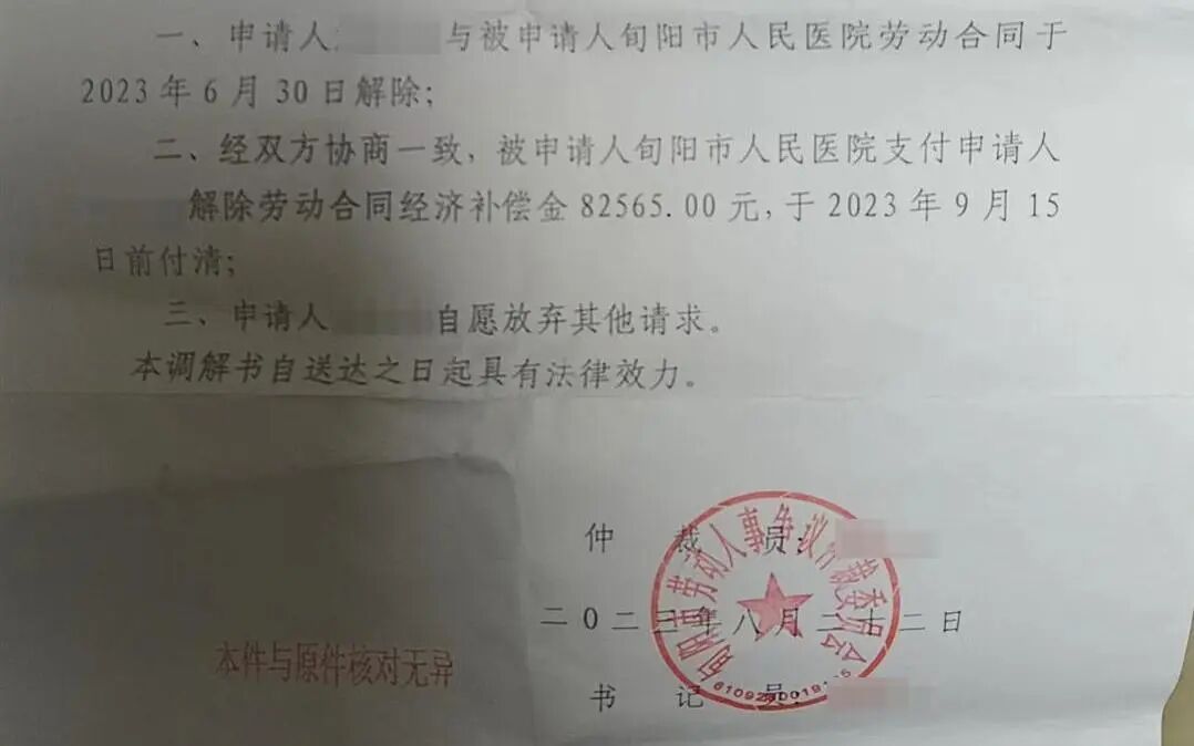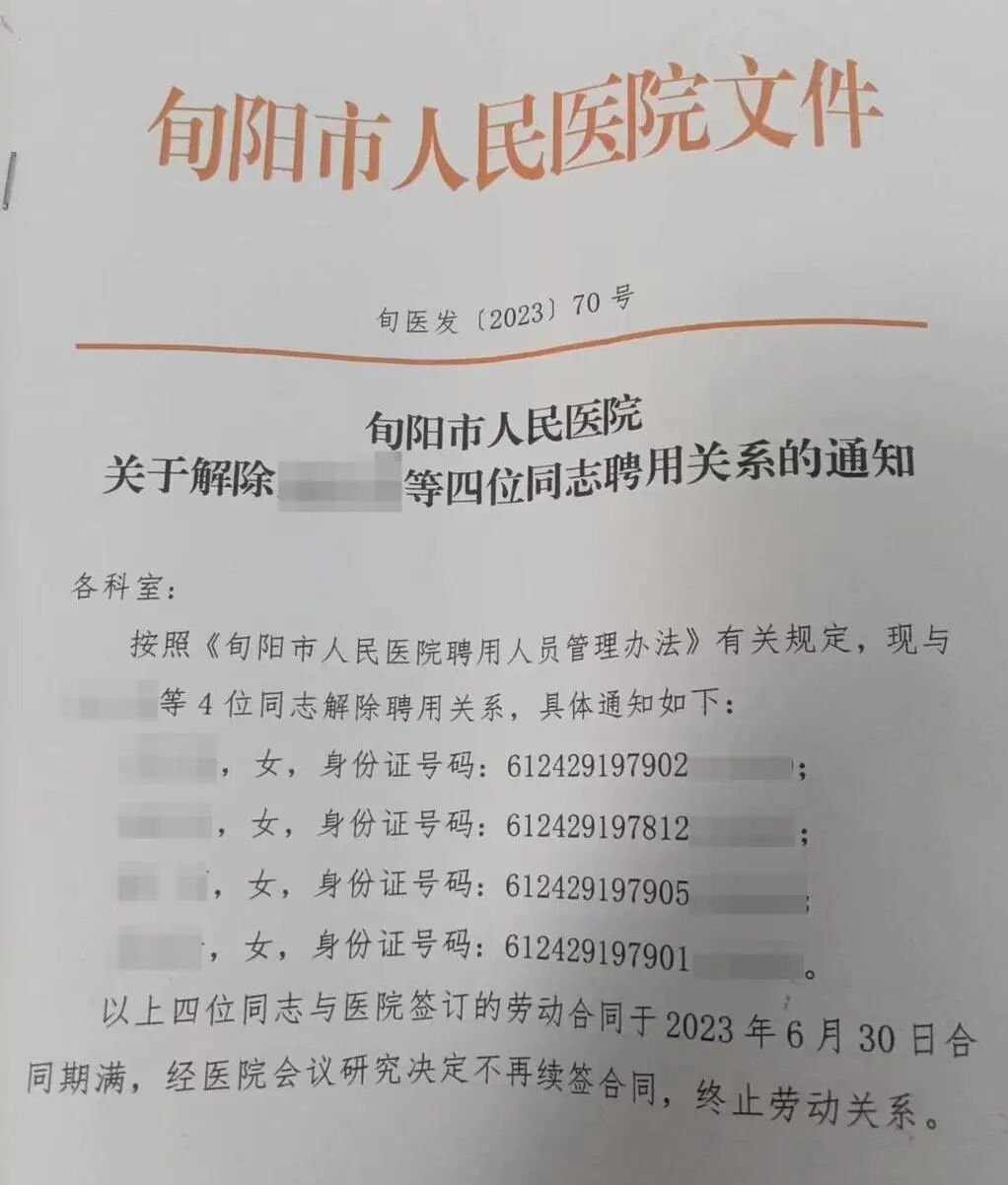 2023年,旬阳市人民医院解除四位同志聘用关系的通知。受访者供图