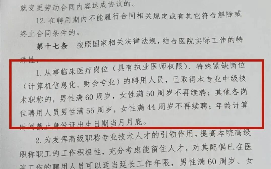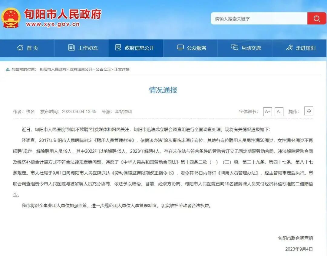 实际上,“男满50女满44到龄不续聘”这一规定,旬阳市人民医院并非第一次实施。根据旬阳市政府9月4日的通报,2022年以前该医院解聘15人,2023年解聘4人。