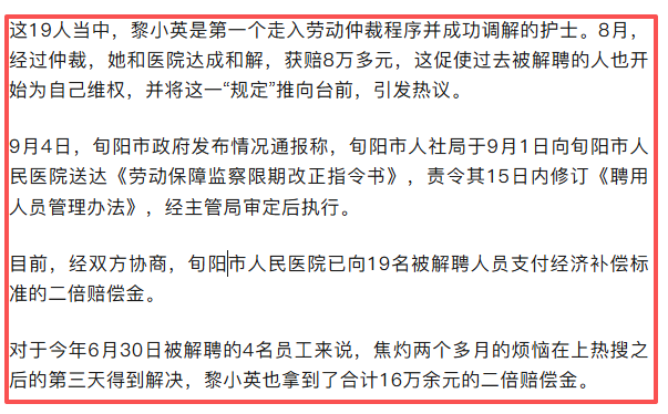 因年满44周岁,今年6月30日,黎小英被陕西省旬阳市人民医院解聘。