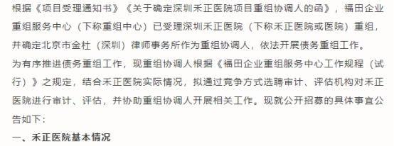 近日,深圳禾正医院重组协调人发布《关于深圳禾正医院债务重组公开招募审计、评估机构的公告》。公告显示,福田企业重组服务中心已受理深圳禾正医院的重组申请,并指定北京市金杜(深圳)律师事务所作为重组协调人,依法开展债务重组工作。