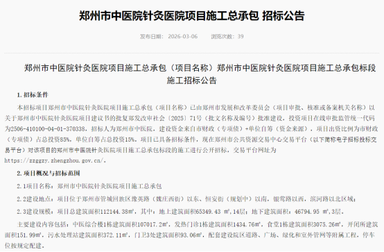日前,郑州市中医院官网发布《郑州市中医院针灸医院项目施工总承包招标公告》,项目合同估算价达6.76亿元。