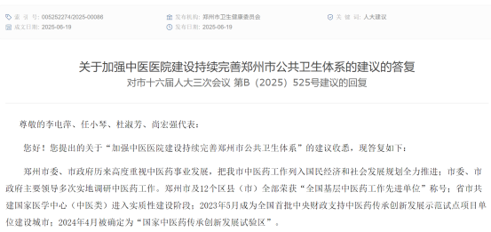 据郑州市卫健委2025年6月发布的《关于加强中医医院建设持续完善郑州市公共卫生体系的建议的答复》显示,为了大力推动国家医学中心(中医类)建设,加快中医药事业成高原、针灸事业起高峰,按照郑州市委、市政府的决策部署,立足郑州资源优势和中医药发展实际,依托郑州市中医院,联合世界针灸学会联合会、中国针灸学会建设世界(中国)中医针灸中心。