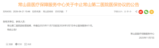近日,浙江省衢州市常山县医疗保障服务中心发布公告,宣布中止常山第二医院的医保协议。公告显示,常山第二医院因经营困难,申请自2025年11月7日起至2026年5月7日中止医保服务6个月。