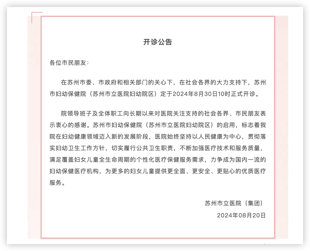8月20日,苏州市立医院发布公告,决定从即日起,正式停止白塔院区产科门诊、急诊、病房接诊及产科建卡服务。苏州市立医院把停诊后的产科及产科医务人员,合并到了即将启用的苏州市妇幼保健院(苏州市立医院妇幼院区)中,并提出“力争成为国内一流妇幼保健医疗机构”的目标。