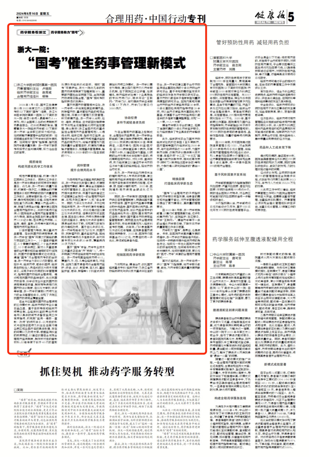 2024年1月8日,国家卫生健康委公布2022年度三级公立医院绩效考核(以下简称“国考”)结果。浙江大学医学院附属第一医院(以下简称浙大一院)连续5年进入最高等级A++序列,并以全国第二名的成绩刷新历史最佳排名。这份成绩单的背后,蕴藏着浙大一院临床药学部(以下简称浙一药学)全体职工的努力和付出。如何破解药事管理中出现的瓶颈?如何把握当前形势下药学学科的发展机遇?如何用好“国考”指挥棒,推动医院药学高质量发展?浙一药学不断思考并探索这些关键问题,努力给出自己的答案。
