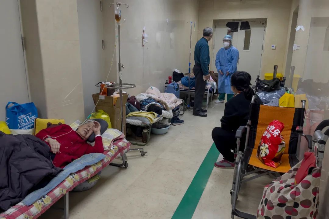 2023年1月5日,北京一家医院里,患者在走廊上休息,接受静脉点滴。(图|视觉中国)