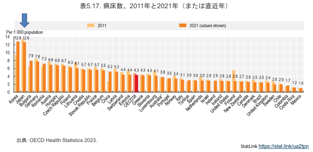 另一方面,中国的医疗服务供给体系过度庞大,会诱导需求。根据《2023 年我国卫生健康事业发展统计公报》的统计,全国床位共有1017.4万张,每千人口医疗卫生机构床位达7.23张。一般来说,医疗服务体系供给有多大,需求就有多大。如果医院开了500张床,一定会让它住满。即使你来看门诊的,本来达不到住院的条件,但是医院要赚钱,就会让床位住满。