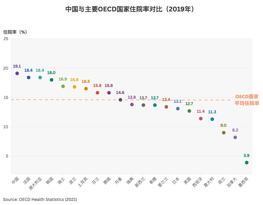 根据经济合作与发展组织(OECD)数据,世界主要经济体的住院率平均仅为14%,这意味着中国的住院率不仅高于大部分发达国家,也高于很多主要的发展中国家。如果住院率一直居高不下,我国医保资金可能会有穿底风险。
