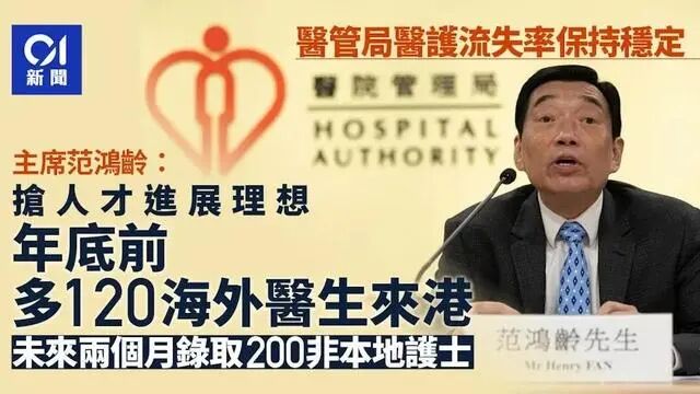 据“香港01”报道,医管局主席范鸿龄表示,“抢人才”进展理想,年底前多120名非本地培训医生来港。加上已在岗人员,估计今年底会有超过250名非本地培训医生加入公营医疗系统为市民服务。