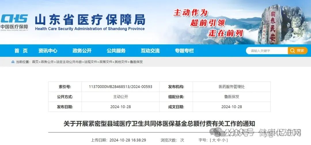 10月28日,山东省医保局发出《关于开展紧密型县域医疗卫生共同体医保基金总额付费有关工作的通知》,该通知指出,以县域医共体为载体,充分发挥医保在资源配置中的杠杆调节作用,推进医疗、医保、医药协同发展和治理,推进县域内整合型、连续性医疗服务,提升基层医疗卫生服务能力,助推分级诊疗,不断提高医保基金县域使用效能。