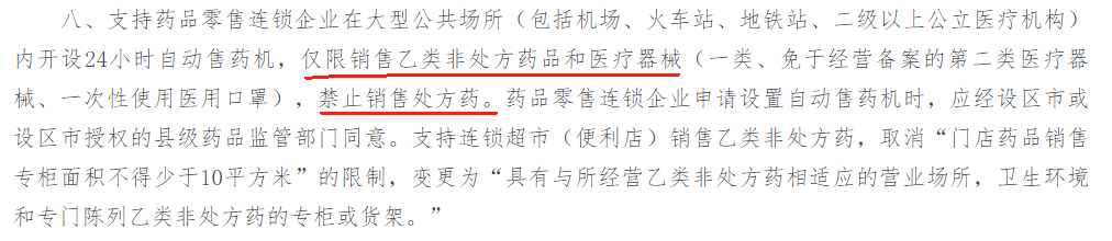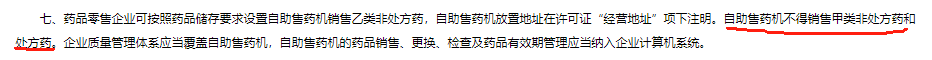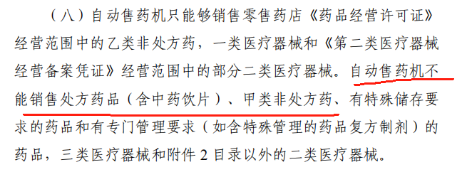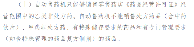七、药品零售企业可按照药品储存要求设置自助售药机销售乙类非处方药,自助售药机放置地址在许可证“经营地址”项下注明。自助售药机不得销售甲类非处方药和处方药。企业质量管理体系应当覆盖自助售药机,自助售药机的药品销售、更换、检查及药品有效期管理应当纳入企业计算机系统。