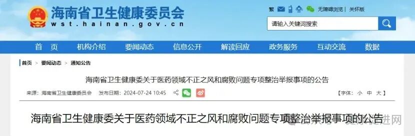7月24日,海南卫健委发布《海南省卫生健康委关于医药领域不正之风和腐败问题专项整治举报事项的公告》。