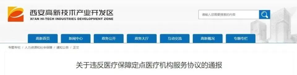 近日,西安高新区社会保险基金管理中心发布了关于违反医疗保障定点医疗机构服务协议的通报。