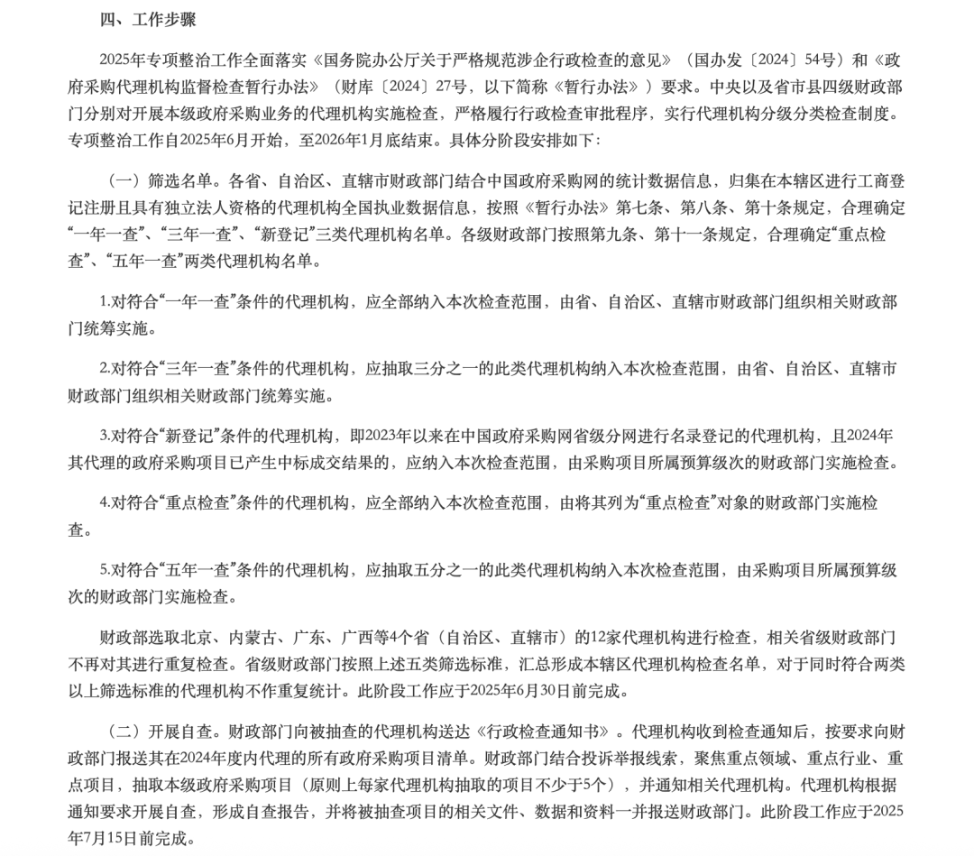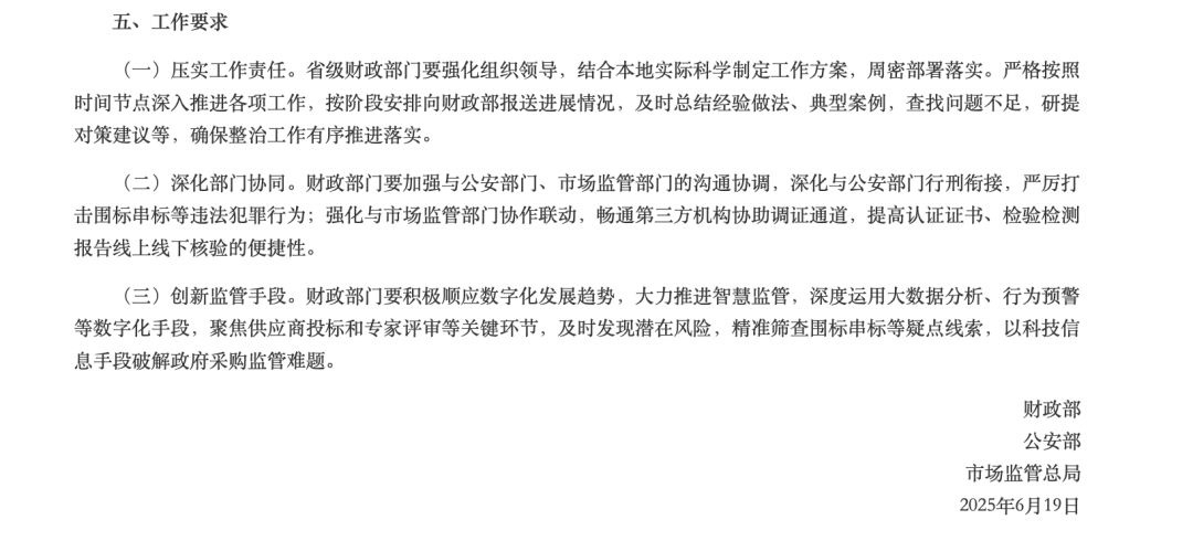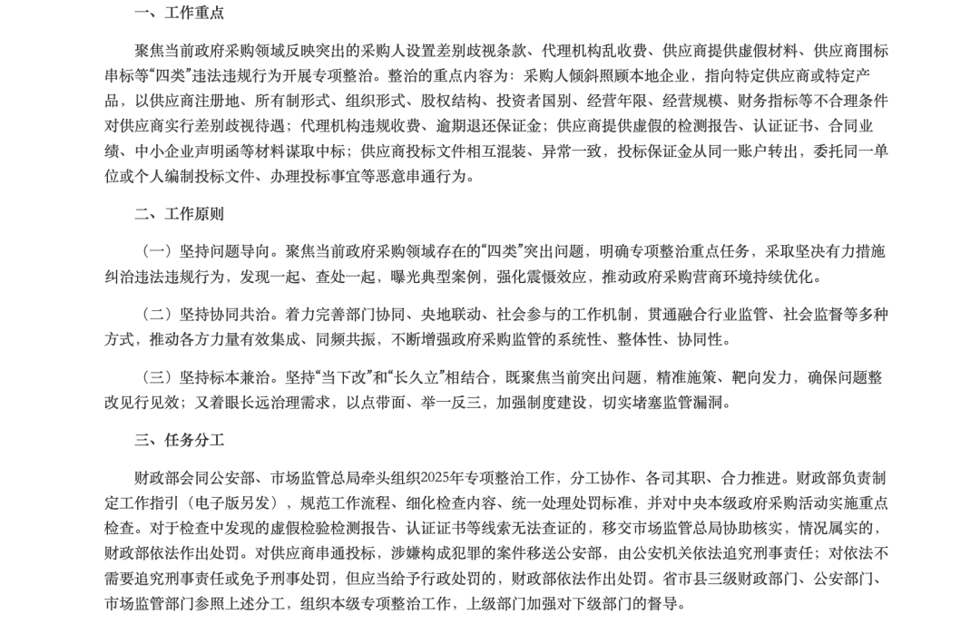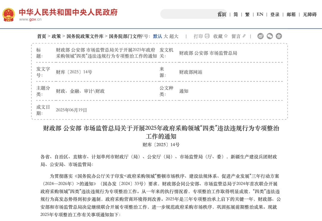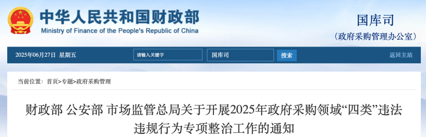 近日,财政部发布《财政部公安部市场监管总局关于开展2025年政府采购领域“四类”违法违规行为专项整治工作的通知》(附文末)。
