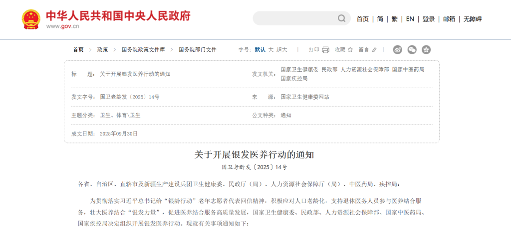 11月4日,国家卫生健康委、民政部等5个部门公布《关于开展银发医养行动的通知》,提出支持退休医务人员参与医养结合服务,壮大医养结合“银发力量”,促进医养结合服务高质量发展。