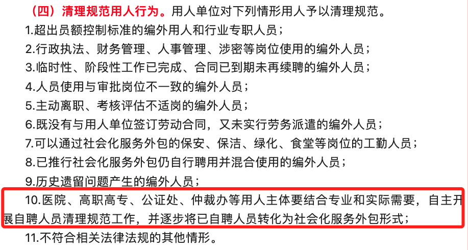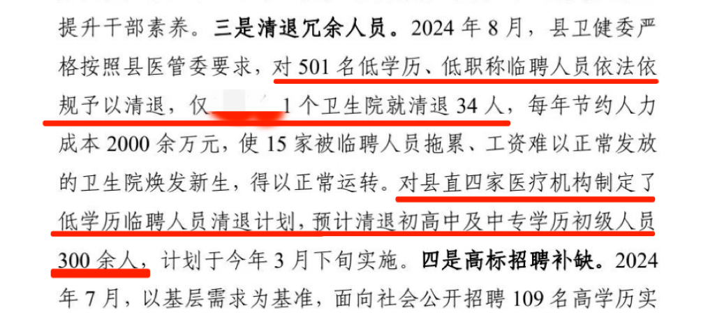 低学历临聘人员是此次重点清退的对象。未来,医疗机构清退冗余人员或成行业趋势。 近日,贵州省发布《进一步促进贵州省乡村医生队伍专业化规范化发展的政策措施》(以下简称《措施》),这份文件提出了十项措施以加强贵州乡村医生人才队伍建设,而其中最受关注的一条政策就是《措施》明确提出“严格准入与退出机制”,将招聘“门槛”进一步提高。 图源:贵州省人民政府 《措施》要求,新招聘的乡村医生,应当具备执业(助理)医师资格;不满足上述条件的,可在中等以上医学专业学历人员或经培训达到中等以上医学专业水平的人员中招聘,经岗前培训合格后注册办理乡村医生执业证书。县级每2年对未取得执业(助理)医师资格的乡村医生开展从业情况考核,考核不合格且逾期未提出再次考核申请或经再次考核仍不合格的,注销执业注册并收回乡村医生执业证书。 这意味着,未来几年内,贵州部分不具备相应资质或考核不合格的村医,可能将被分流、转岗或清退。 此次改革并非“一刀切”进行清退,而是通过考核、培训、转岗等多种路径,引导村医队伍逐步专业化。 多地已开始清退编外,或成大势所趋 事实上,从去年开始,医疗系统就一直在有计划地进行清退,清退对象基本都是编外人员。 2023年,某市发布《市级机关事业单位编外用人清理规范工作方案》,该方案计划在5年内完成市级机关事业单位编外用人清理规范工作,每年精简不少于本单位编外用人员额的20%。当地医院等用人主体要逐步将已自聘人员,转化为社会化服务外包形式。 2024年5月,某县发布《医疗卫生单位编外聘用人员专项清理整治工作实施方案》,针对各医疗卫生单位编外用人问题开展集中清理。该县的清理工作聚焦年龄、能力达标、长期在编不在岗等维度,通过精准清理,优化编外人员结构。 此次清理范围广泛,涵盖 9 大对象,包括非卫生专业技术人员从事卫生专业技术岗位工作、男年满 60 周岁且女年满 50 周岁、卫生专业技术人员自上岗之日起 5 年内未取得相关卫生专业技术资格等情况。 同时,将连续旷工超过 15 个工作日,或者 1 年内累计旷工超过 30 个工作日,以及年度考核不合格且不同意调整工作岗位,或者连续两年年度考核不合格的人员,均纳入清退范围。 今年年初,《政府工作报告》中首次提及「严控财政供养人员规模」。 今年4月,多家知名大三甲传出裁员消息,裁员计划主要集中在行政后勤岗位,裁员比例高达30%。 与此同时,江西省在公立医院改革中也采取了类似措施,缩减了23个行政科室,行政后勤与一线人员的人均薪酬比下降了15%。 今年5月,某县卫生系统开展了大规模裁员行动。据官方发布的消息,今年3月下旬,该县对县直四家医疗机构制定了低学历临聘人员清退计划,预计清退初高中及中专学历初级人员300余人。 这算是第二轮清退了,2024年8月,该县卫健委严格按照县医管委要求,对501名低学历、低职称临聘人员依法依规予以清退,有卫生院一次性被清退34人。 实际上,该县医改经验已成为该省推广三明医改经验的典型案例之一,而“清退冗余人员”正是医改经验关键举措。在这样的基调下,清退编外人员、精简编制或已成为大势所趋。 医务人员如何应对? 随着医疗机构 “瘦身” 加速,基层医护人员学历提升工作也在推进。 新《医师法》规定,具有高等学校相关医学专业专科以上学历,满足条件后才能参加执业助理医师资格考试。 多地出台相关规定提升基层医护人员学历,如贵州省要求 2020 年县级医疗卫生机构 45 岁以下执业医师全部达到本科以上学历;广西开展基层卫生人员学历提升计划专项招生工作。 对于这种清退,短期内,可能导致基层医疗服务人员数量减少,部分岗位出现空缺,在一定程度上影响服务的及时性和全面性。但从长期来看,如果能合理利用节约的成本,加强对留下来人员的培训,以及补充高素质人才,有助于提升基层医疗服务的质量和效率,优化基层医疗服务体系。 对于受到影响的医务人员,应积极主动应对变革: 一是不断提升自身专业技能,掌握扎实的真本事,学习远程医疗、人工智能辅助诊断等新兴技术知识,紧跟行业前沿,增强核心竞争力。 二是提前规划职业发展,重新审视职业规划,结合兴趣特长探索多元化发展方向。 三是积累行业资源:在日常工作中注重与同事、同行建立良好关系,加入专业学术团体和行业协会,拓展人脉资源,为获取职业信息、发展机会以及应对职业困境提供支持 。 在时代浪潮的冲击下,医疗行业正经历深刻变革,“铁饭碗” 已成为过去式。唯有不断提升自身能力,积极主动应对挑战,医务人员才能在这场变革中站稳脚跟,拥抱行业发展的新未来。 来 源 / 华医网综合