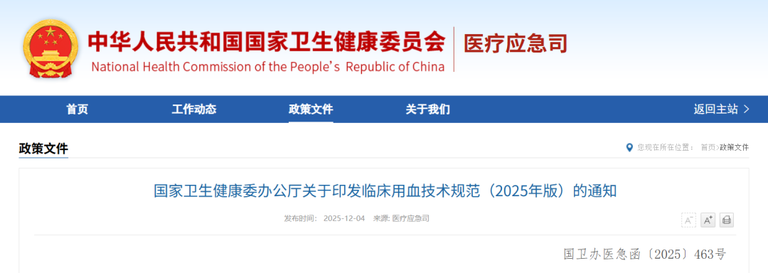国家卫生健康委办公厅关于印发临床用血技术规范(2025年版)的通知