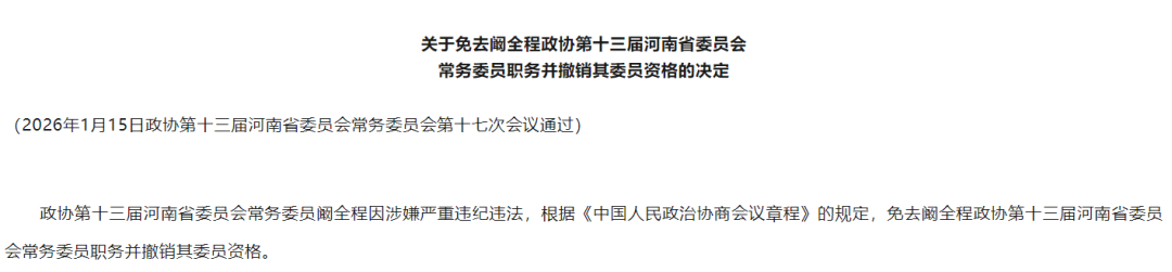 1月16日,河南省政协发布十三届常委会第十七次会议通过有关人事事项,《关于免去阚全程政协第十三届河南省委员会常务委员职务并撤销其委员资格的决定》: