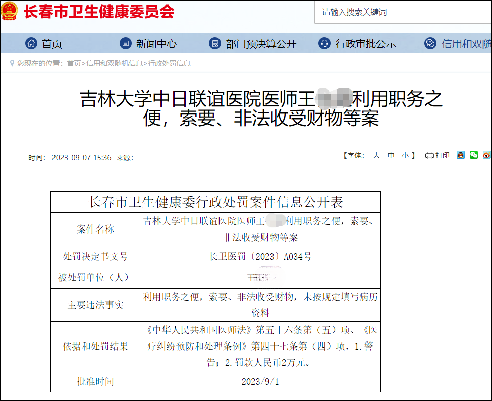 9月7日,长春市卫健委公布了一条行政处罚信息,吉林大学中日联谊医院医师王某某利用职务之便,索要、非法收受财物,未按规定填写病历资料,被当地卫健委警告、罚款2万元。