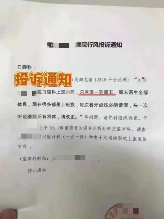 据了解,该患者周末前往医院看牙,却发现医院的口腔科没人上班,经询问得知该科室的医生周末全都是双休的。对此,患者很不满,多数患者仅能在工作日之外的周末安排就医时间,特别是看牙这样的需求,只有周末才有时间到医院就诊,哪有看个牙还要请假的道理?