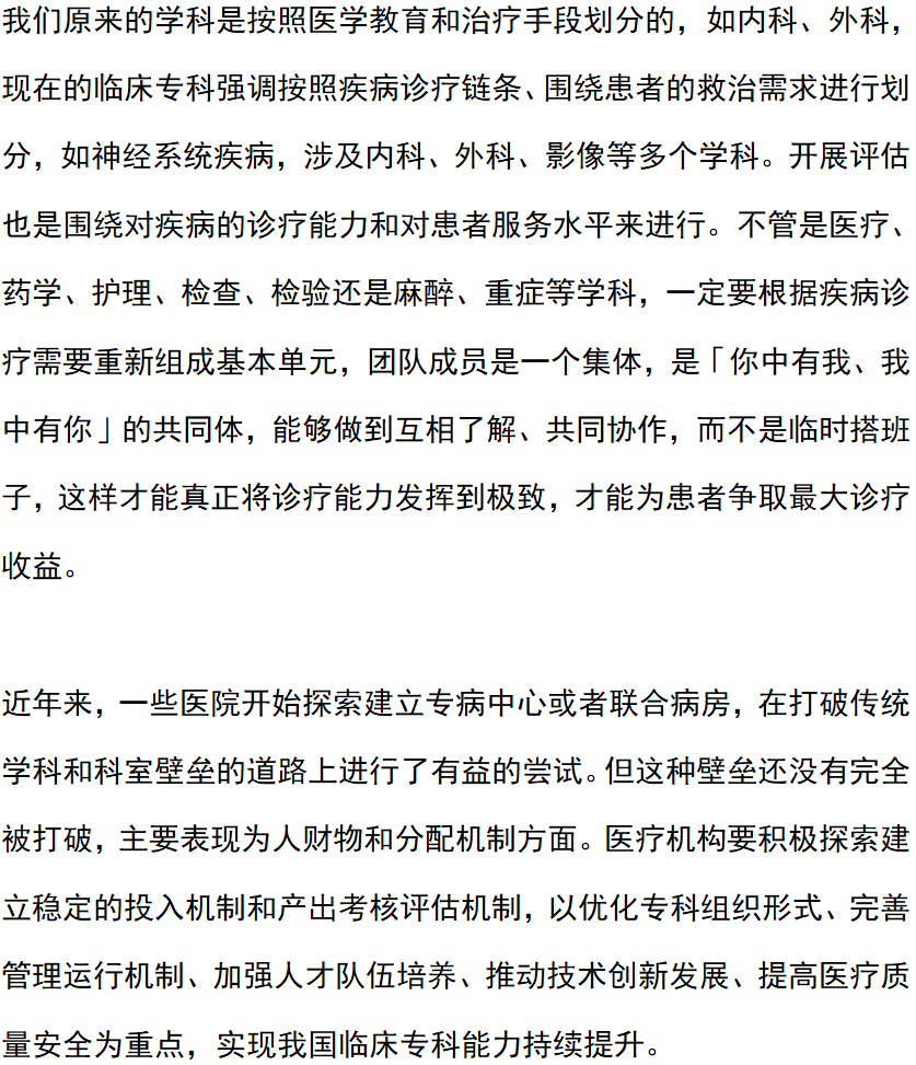 国家卫生健康委医政司医疗质量与评价处处长马旭东在接受记者专访时表示,开展临床专科能力评估旨在引导医院打破医学学科壁垒,充分整合资源构建新型临床专科,让患者得到最优化的诊疗策略和方案,最大限度提升医疗服务质量和效率。