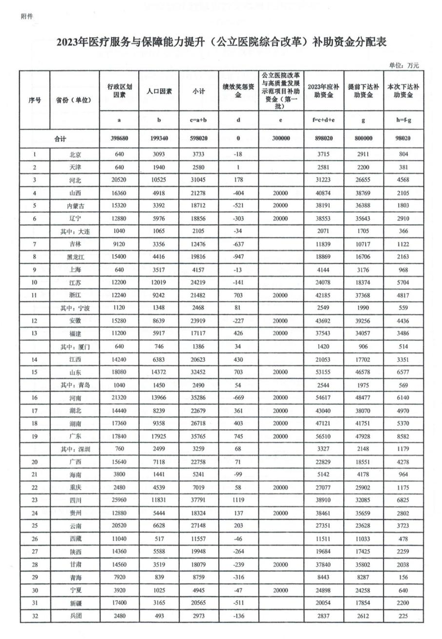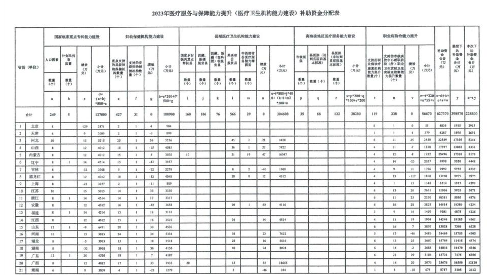 5月24日,国家财政部发布了《财政部 国家卫生健康委关于下达2023年医疗服务与保障能力提升(医疗卫生机构能力建设)补助资金预算的通知》(以下简称《通知》)。 《通知》中,国家财政部、国家卫生健康委两部委要求,各省须在21日内上报有关直达资金分配到市县基层的方案,经审核同意后下达到市县。 据补助资金分配表来看,2023年医疗卫生机构能力建设补助资金总额为62.737亿元,对比2022年的59.943亿元,资金数量相差不大。 与此同时,国家财政部还下发了《2023年医疗服务与保障能力提升(公立医院综合改革)补助资金预算》。 据补助资金分配表,国家下发的2023年公立医院综合改革补助资金共计89.802亿元,对比2022年的80.392亿元,金额有所提升。 实际上,早在2022年11月,财政部就曾提前下发了119.857亿元补助资金,加上本次下达的32.682亿元,两笔补助资金全部下达完成,主要用于推进全国公立医院综合改革以及提升医疗卫生机构能力建设和服务水平。 具体而言,以上152.5亿资金将流向何处呢? 据补助资金分配表来看,2023年医疗卫生机构能力建设62.737亿补助资金,重点用于支持5大类1977个医疗机构能力提升建设。 具体包括:254个国家临床重点专科、937个县域医疗卫生机构、458个妇幼保健机构、225个高海拔地区医疗机构能力建设,以及457个诊疗康复机构能力提升。 其中: 县域医疗卫生机构能力建设项目,对国家乡村振兴重点帮扶县在2022年400万元/县的基础上翻倍至800万/县的标准予以补助。 高海拔地区医疗五福能力提升建设项目,对高海拔地区每个地级市1家市级医院,按200万/医院予以补助;每个县1家县级医院基本标准达成情况,按100(达到)-200(未达到)万/医院予以补助。 职业病防治能力提升项目,对诊疗康复机构按照320万/个予以补助。 也就是说,上述范畴内的所有医疗机构将作为被扶持对象,享受到国家财政实实在在的“真金白银”支持。 在公立医院综合改革方面,此前国家卫健委、财政厅联合下发的《关于组织申报2023年中央财政支持公立医院改革与高质量发展示范项目的通知》文件中,就明确指出,公立医院改革与高质量发展示范项目主要聚焦三个方面:1.着力提升市县级公立医院诊疗能力;2.着力加强智慧医院建设;3.着力控制医疗费用不合理增长。 其核心建设方向包括:支持市县级公立医院传染病、精神病、急诊急救、重症医学、心脑血管、妇产科、儿科等临床专科建设等。 众所周知,设备增配、升级是医疗机构能力提升绕不开的一环。 而根据国务院办公厅发布的《关于城市公立医院综合改革试点的指导意见》,公立医院综合改革中还包括落实公立医院基本建设和设备购置,配备相应的大型医用设备。同时,文件强调,公立医院要优先配置国产医用设备。 毋庸置疑,在百亿财政资金落实后,全国公立医院医疗服务提升的同时,势必会带动相关科室建设和医疗设备升级更新,利好所有医械人。 以妇幼保健机构为例,去年4月国家卫健委发布了新版《妇幼保健机构医用设备配备标准》,新版标准要求,二级妇幼保健机构必须配置的医疗设备达193种,三级妇幼保健机构在二级妇幼保健机构基本设备品目基础上增配56种。 同时根据发展需求,还需酌情配备手术机器人、胎儿镜、可穿戴设备、临床决策支持系统等创新设备。具体清单如下: 关于县级医院,想要达到三级医院医疗服务水平,同样需要对照设备清单配齐三级医院必需的医疗设备,催生相关设备新一轮的配置热潮! 附:县医院升三级必备医疗设备清单