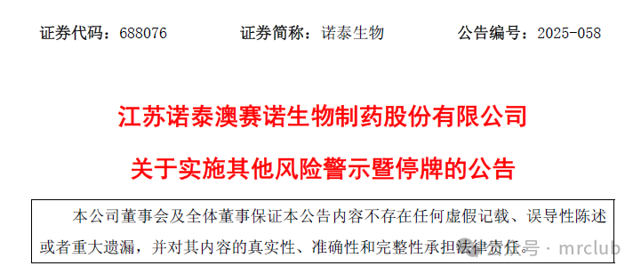 随后,诺泰生物发布《关于实施其他风险警示暨停牌的公告》,表示公司股票将被实施其他风险警示,股票停牌一天,股票简称由“诺泰生物”变更为“ST 诺泰”。