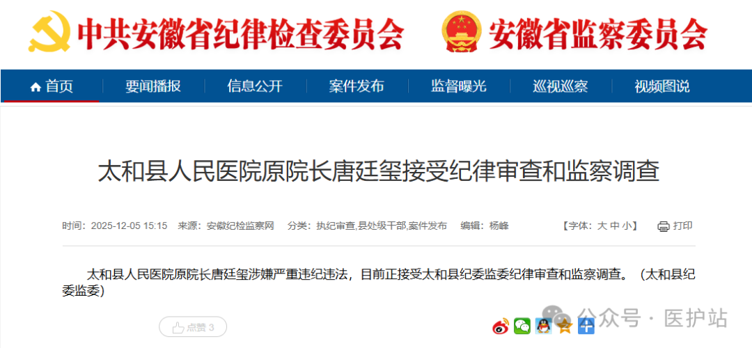 12月5日消息,阜阳市太和县人民医院原院长唐廷玺接受纪律审查和监察调查