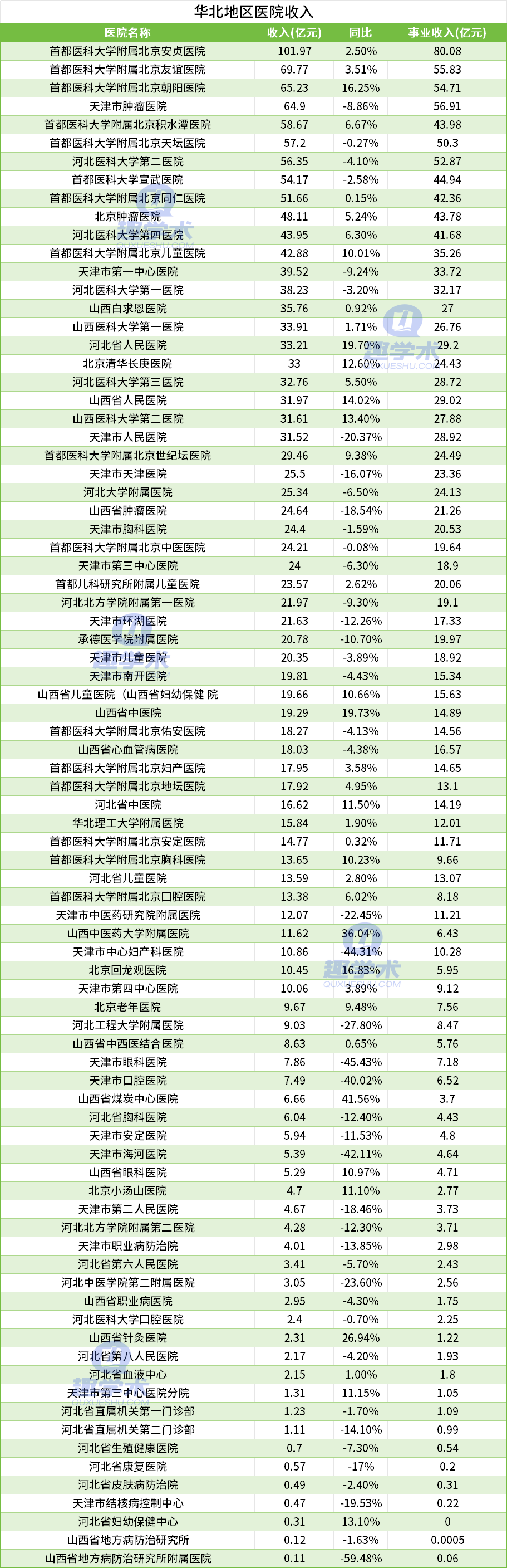 另外天津市肿瘤医院以64.9亿元的收入位列第四,河北医科大学第二医院位列第七,这两家医院收入均下滑。