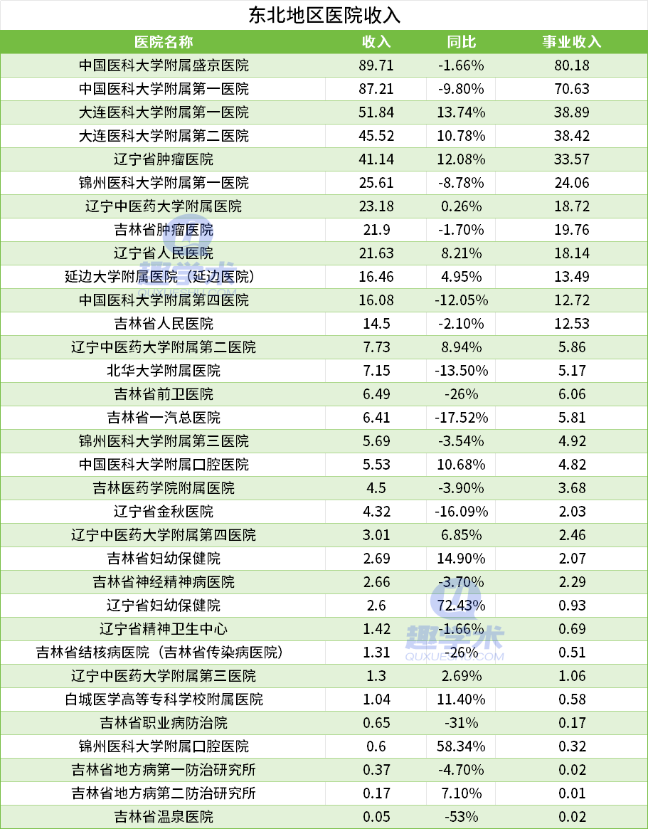 从收入规模来看,东北地区医院收入整体不高,仅有3家医院收入超过50亿元,15家医院收入不到5亿元。其中,中国医科大学附属盛京医院是该地区收入最高的医院,达89.71亿元,同比下降1.66%;中国医科大学附属第一医院次之,年收入87.21亿元,同比下降9.8%。