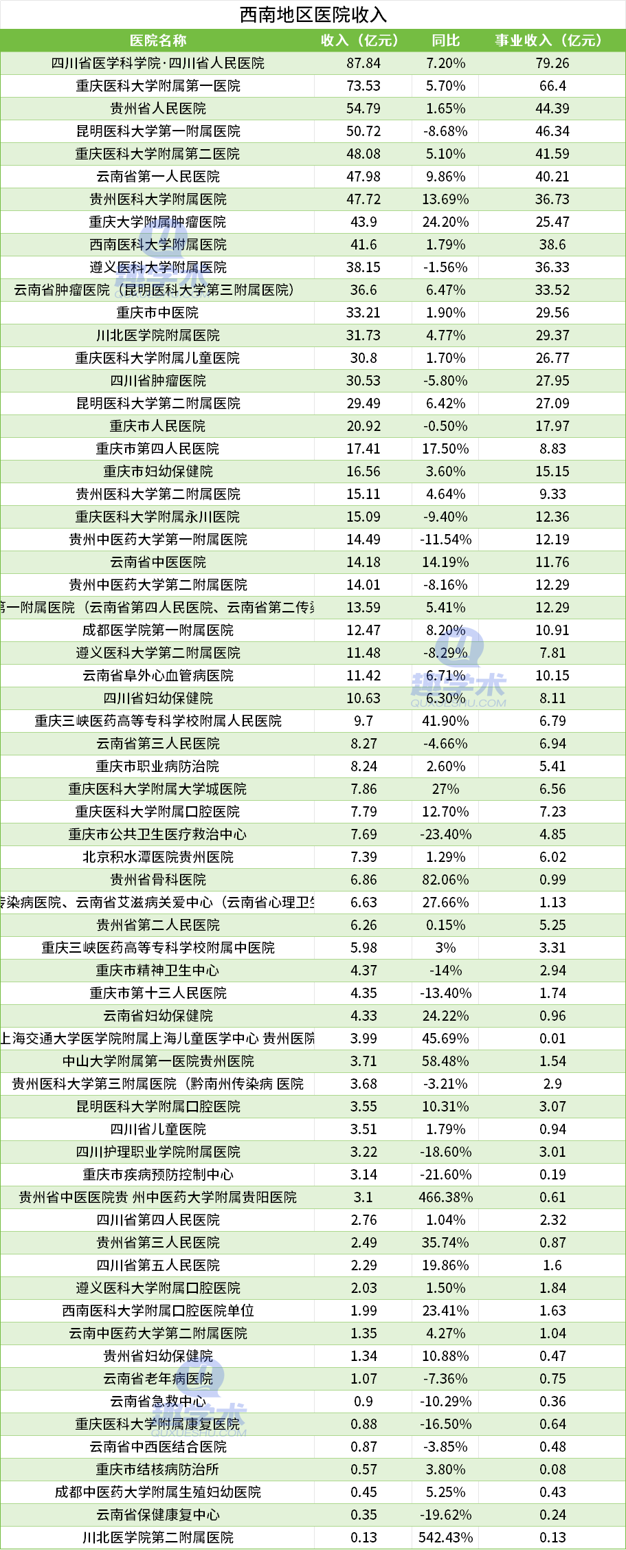 其中收入最高的医院是四川省人民医院,收入87.84亿元,同比增长7.2%;其次为重庆医科大学附属第一医院、贵州省人民医院、昆明医科大学第一附属医院。且在收入排名前10的医院中,西南四个省市分布较为均匀。